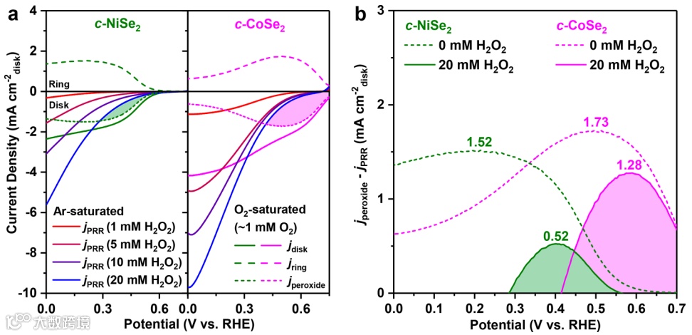 图8. c-NiSe2 和 c-CoSe2 2e- ORR 催化剂上过氧化物还原反应 (PRR) 的 RRDE 研究。(a) c-NiSe2 和 c-CoSe2 催化剂在 O2 饱和的 0.05 M H2SO4 中,在 1600 rpm 下的盘电流密度 (jdisk)、环电流密度 (jring) 和部分电流密度 (jperoxide),以及在含有 1、5、10 或 20 mM H2O2 的 Ar 饱和 0.05 M H2SO4 中、1600 rpm 下的 PRR 电流密度 (jPRR)。(b) c-NiSe2 和 c-CoSe2 催化剂的 H2O2净生成率与 jperoxide-jPRR 的相关性。