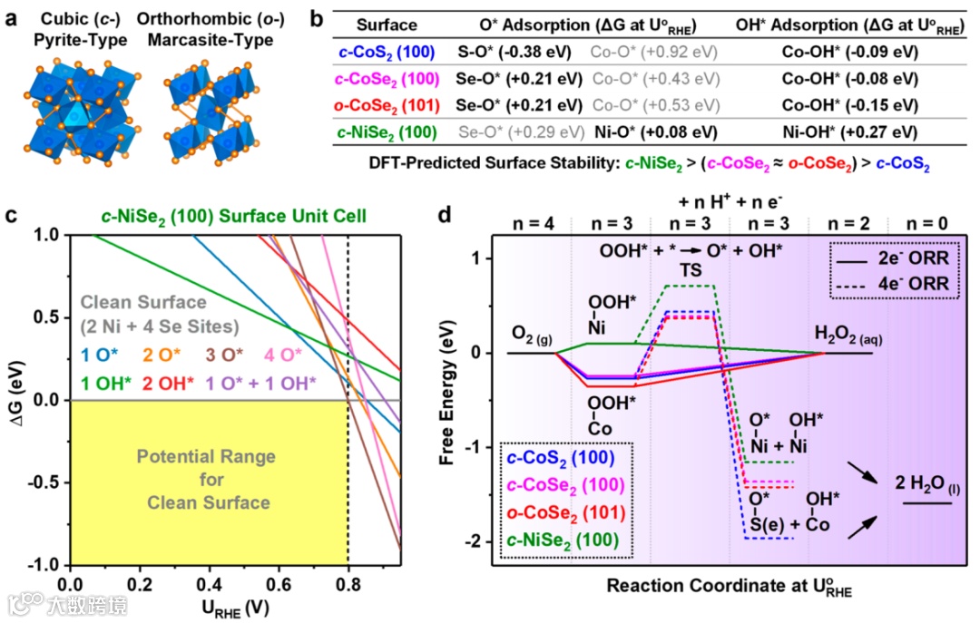 图3. 基于二元金属化合物的 2e- ORR 催化剂(c-CoS2,c-CoSe2, o-CoSe2,和 c-NiSe2)的稳定性、选择性和活性的计算筛选。(a) 黄铁矿型和白铁矿型金属硫族化物的晶体结构。(b) 在 c-CoS2, c-CoSe2, o-CoSe2和 c-NiSe2 的最稳定面上,O* 和 OH* 吸附到优先结合位点的能量。(c) 在包含两个 Ni 和四个 Se 位点的c-NiSe2 (100) 表面晶胞上,不同 O* 和/或 OH* 覆盖率的自由能比较。(d) 2e- 和 4e- ORR 路径的自由能图。