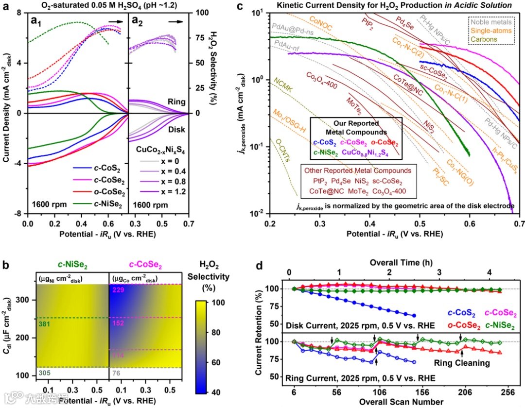 图4. 代表性金属硫族化物 2e- ORR 催化剂的 RRDE 评估。(a) (a1) 二元金属硫族化物 (c-CoS2,c-CoSe2, o-CoSe2和 c-NiSe2) 和 (a2) 硫尖晶石(CuCo2-xNixS4,0 ≤ x ≤ 1.2)催化剂的 RRDE 伏安图和相应的 H2O2 选择性;在 O2饱和的 0.05 M H2SO4 中,以 1600 rpm 的速度运行。(b) c-NiSe2和 c-CoSe2 的 H2O2 选择性和双层电容 (Cdl)与电位的关系。(c) 基于金属化合物的 2e- ORR催化剂与最近报道的其他类别催化剂的 H2O2 电合成动力学电流密度比较。(d) c-CoS2, c-CoSe2, o-CoSe2和 c-NiSe2 在 0.05 M H2SO4 中的 RRDE 稳定性测试。