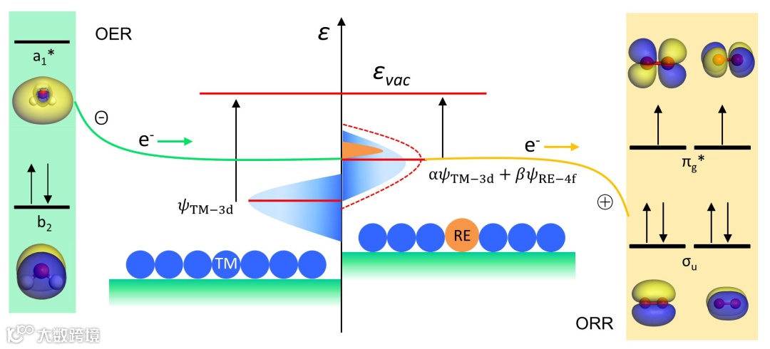 由于氧还原 (ORR)和氧析出反应(OER)之间的竞争吸附,开发具有双功能性质的可逆氧电催化剂对于金属-空气电池等能源转化技术具有重要意义。然而,ORR和OER均涉及复杂的四电子途径和多步化学键断裂与形成过程,导致反应动力学缓慢与热力学限制。当前Pt/C、IrO2和RuO2被认为是最好的ORR或OER催化剂,但其储量稀少、价格高昂、稳定性不足等问题极大地限制了在氧电催化反应中的实际应用。为开发贵金属催化剂的替代品,利用电子调控策略开发过渡金属(TM)催化剂作为氧电催化剂受到了广泛研究。对于过渡金属,杂原子掺杂通过d-d和d-p轨道耦合作用可以扰动原始的d带电子结构,其中d带中心(εd)向费米能级(EF)的相对位移决定了金属-氧共价性。通过调整电子结构,可以打破TM与O结合能的线性关系束缚,使其更接近贵金属基材料,从而表现出良好的氧电催化活性。不同于过渡金属的d和p轨道,具有高简并性和局域性f轨道的稀土元素在电催化领域近年来愈发受到重视。其独特的4fx5dy6s2价电子构型,由于价层的f-d-p轨道的有效耦合使得对氧电催化的灵活调控成为可能。然而,稀土类催化剂仍存在一些合成障碍和内在缺陷。例如其较大的原子半径导致在高温处理过程中倾向于迁移到催化剂表面,造成活性位点数量减少,同时稀土元素本身作为助催化剂几乎没有氧电催化活性。因此,同时实现保存催化剂表面足够的活性位点,充分利用稀土金属的促进作用,以及稀土与过渡金属的有效偶联仍然是一个亟待解决的问题。
