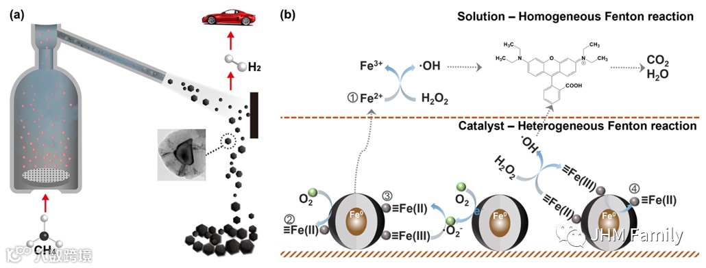 近日,悉尼大学陈元教授研究组在Journal of Hazardous Materials上发表了题为“Carbon/iron by-product from catalytic methane decomposition as recyclable Fenton catalyst for pollutant degradation”的研究论文。本文以催化裂解甲烷制备绿色氢气的副产物作为芬顿反应的催化剂,实现有机物的高效去除,并揭示了其反应的主要机理。研究结果为芬顿反应在污水处理上的应用提供了新的思路,也为催化裂解甲烷制备氢气的过程带来了额外的经济效益。