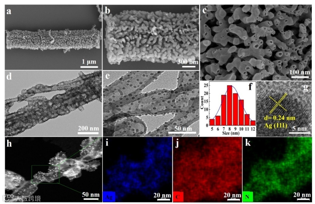 图2 ACNNT-2的形貌及微结构信息:SEM (a-c),TEM (d-g),ACNNT-2的银颗粒的粒径分布情况(f),HAADF-STEM (h-k)。