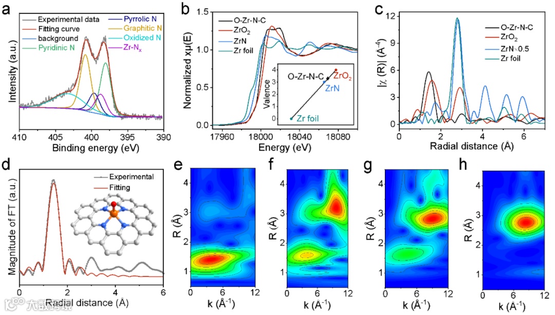 图 2. 单原子Zr位点的配位。(a) O-Zr-N-C的N 1s XPS光谱。O-Zr-N-C、ZrO2、ZrN 和 Zr 箔的 Zr K-edge (b) XANES 和 (c) k3 加权傅里叶变换光谱。(d) O-Zr-N-C 的 R 空间曲线拟合。插图说明了 Zr 位点在 O-Zr-N-C 中的拟合结构。灰色、蓝色、橙色和红色的球体分别代表 C、N、Zr 和 O 原子。(e) O-Zr-N-C、(f) ZrO2、(g) ZrN 和 (h) Zr 箔的 k3加权 Zr K-edge EXAFS 小波变换。