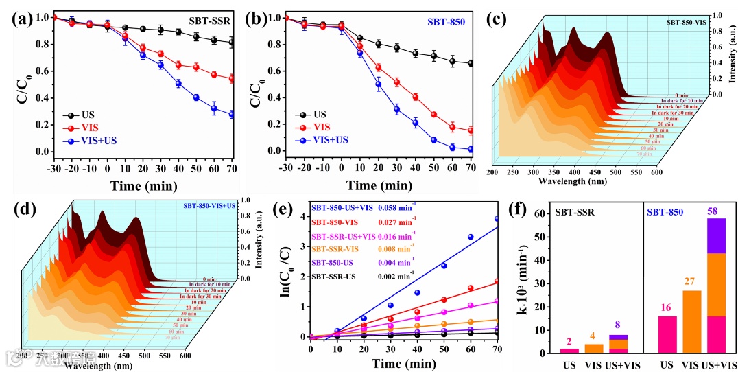 在超声或可见光单一作用下,SBT-850对四环素的降解率分别达到了29%和85%。而在超声和可见光同时作用下,SBT-850对四环素的降解和矿化效率分别达到了98%和78.6% (图3a-d)。同时,压电、光以及压电光催化降解四环素的过程符合一级反应动力学 (ln(Ct/C0) = -kt)。超声和光协同作用下的速率常数达到0.058 min-1,大于可见光 (0.027 min-1)和超声 (0.004 min-1)下速率常数之和 (kus+vis > kus + kvis) (图3e和3f)。