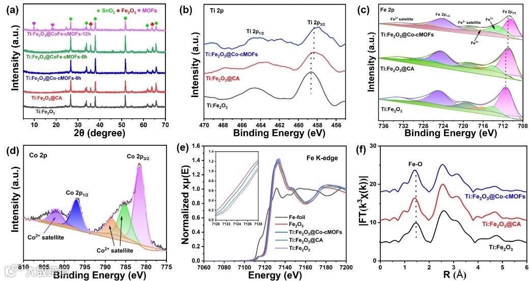 图3 (a) Ti:Fe2O3、Ti:Fe2O3@CA、Ti:Fe2O3@Co-cMOFs和Ti:Fe2O3@CoFe-cMOFs的XRD谱, Ti:Fe2O3、Ti:Fe2O3@CA、Ti:Fe2O3@Co-cMOFs的XPS谱:(b) Ti 2p、(c) Fe 2p 和(d) Co 2p,Fe片、Fe2O3, Ti:Fe2O3、Ti:Fe2O3@CA、Ti:Fe2O3@Co-cMOFs的(e) Fe K-边 XANES 谱和(f) EXAFS傅里叶变换谱