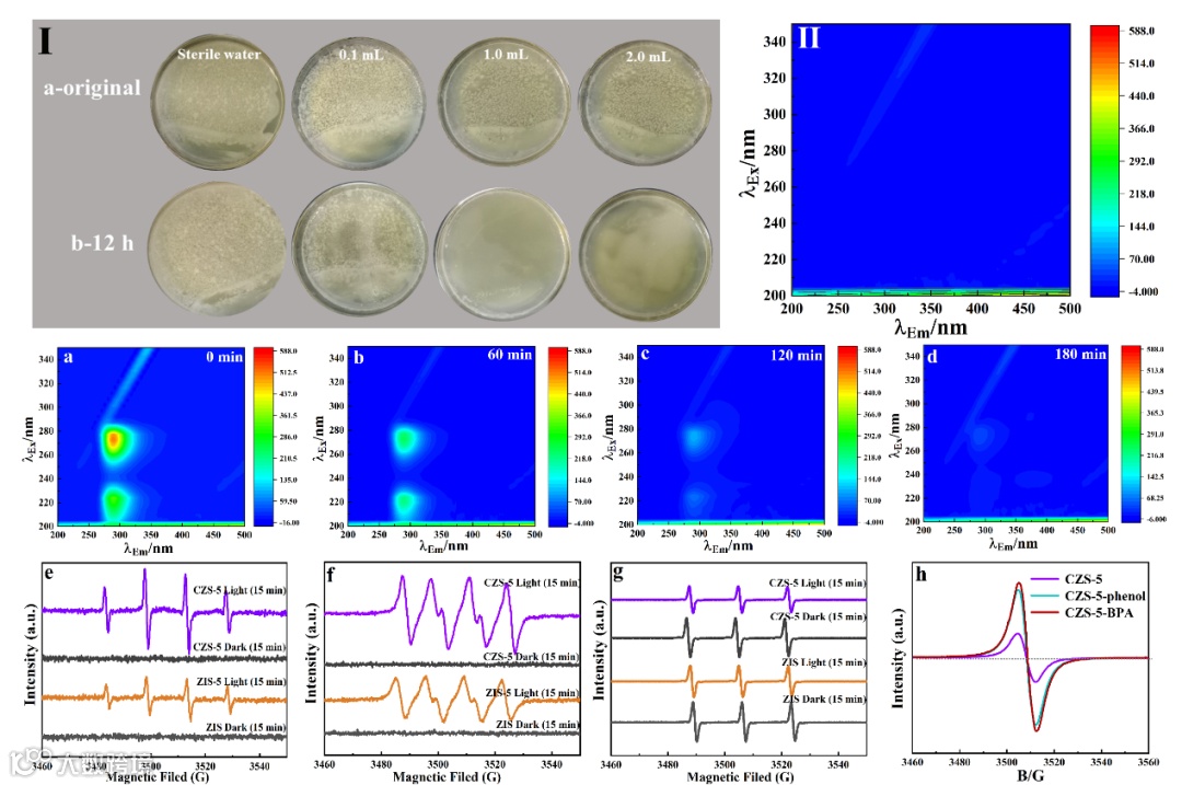 Fig.2. (I)The disinfection of E. coli using the in-situ H2O2 (different volume, mL) generated from the CZS-5 composite; (II) 3DEEM fluorescence spectra of pure water; (a-d) 3DEEM of the phenol (20 mg L–1)degradation process using CZS-5 composite; EPR spectra of ZIS and CZS-5 (e)•OH, (f) ·O2- and (g) h+ in dark reaction and photocatalysis process; (h) element ESR spectra of CZS-5 and absorbed phenol or BPA.