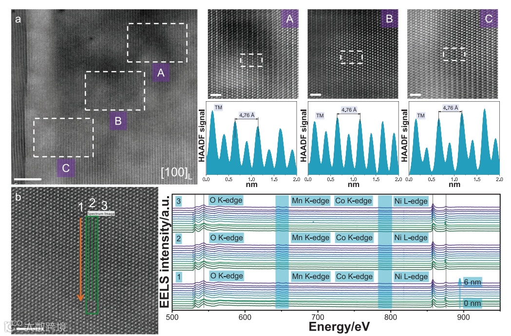 值得注意的是,煅烧过程中的结构形成和衰减过程中的结构变化都与NCM阴极的性能直接相关。目前,在NCM阴极的形成(高温锂化反应)和降解(充/放电)的结构演化方面已经做了很多工作。对于NCM的形成,Wang等人揭示LiNi0.77Co0.1Mn0.13O2高温锂化过程中的结构变化实际上是拓扑相变过程,涉及多个相变。对于NCM降解,活性元素的损失、阳离子迁移和 Li+(脱)嵌入引起的晶格应力导致层状结构的破坏和充放电过程中性能的急剧下降。特别是对于复杂且不稳定的超高Ni体系LiNi1-x-yCoxMnyO2(1-x-y>0.9),Li、O和TM如何相互作用影响结构重建仍有待进一步阐述。