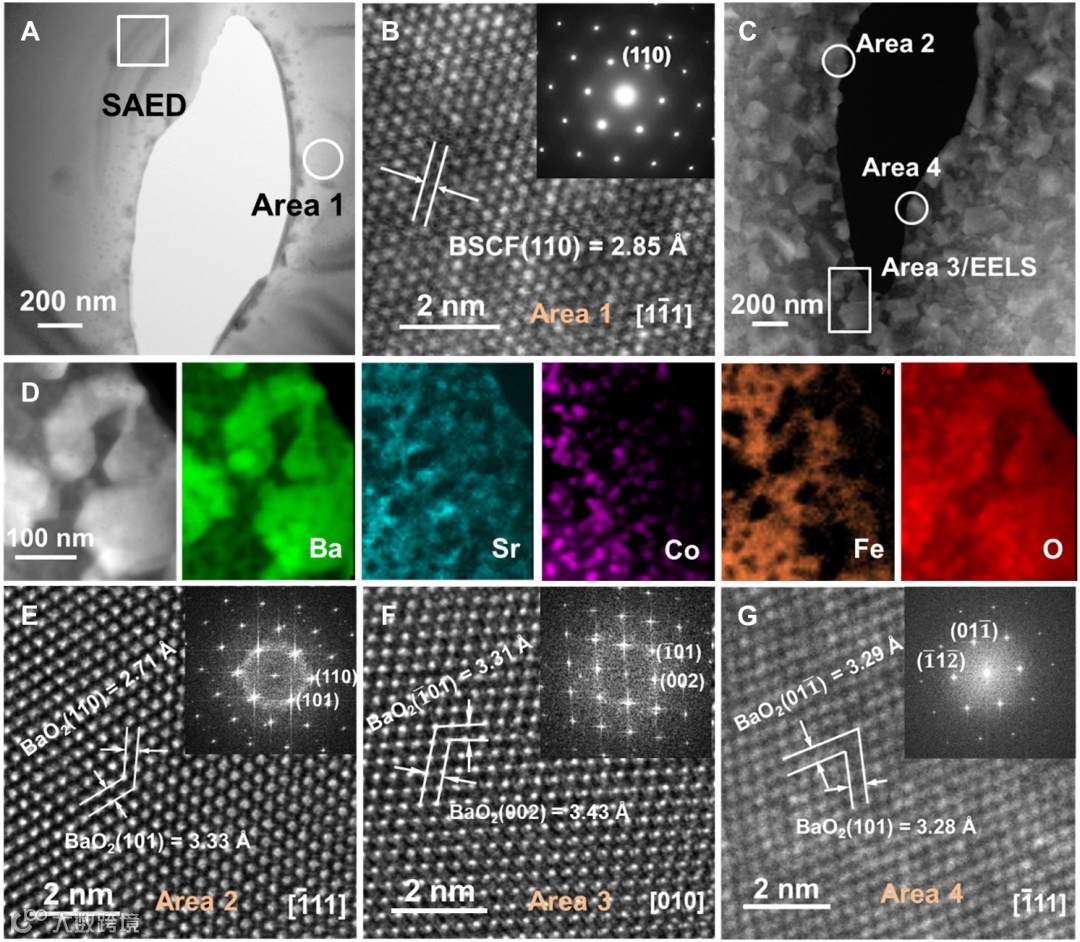 图2. ETEM分析BSCF中原位偏析组分的结构:(a) BSCF在氧化前的低倍率透射电子显微镜(TEM)图;(b) 高分辨TEM图及选区电子衍射(SAED)结果;(c)在900 °C原位氧化20 min后的HAADF-STEM图;(d)STEM-EELS元素映射组分分析;(e-g)不同标记区域三种偏析组分的微结构。