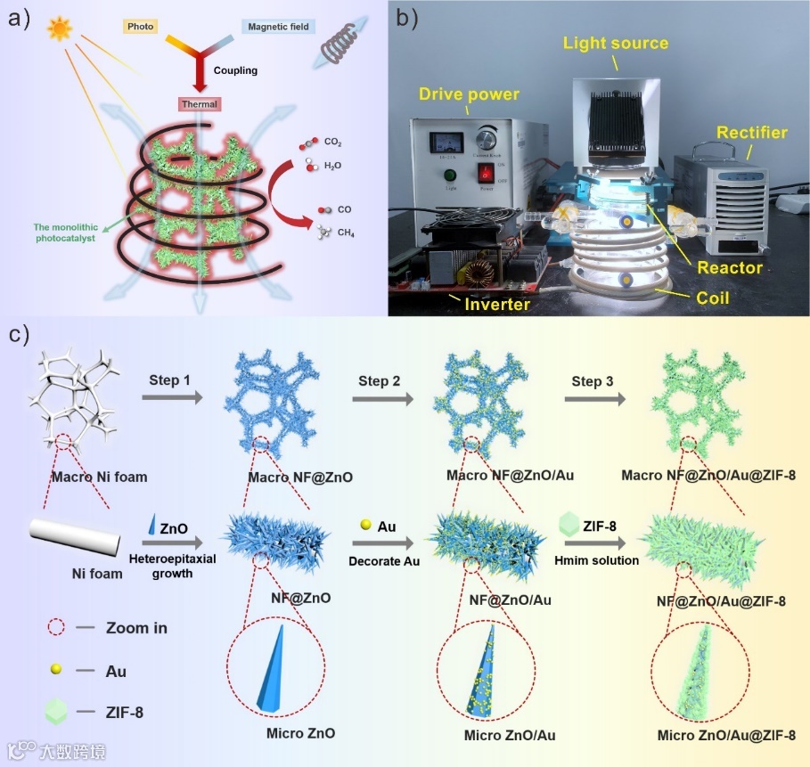 图1显示了整体式催化剂在光热磁耦合反应系统中光还原CO2的示意图。通过引入交变磁场产生磁热,交变磁场与光热催化作用一起形成光热磁耦合协同催化作用。为了在光热磁耦合反应系统中最大限度地发挥光催化剂的催化作用,有必要设计一种特殊结构的整体式催化剂。如图所示,整体式光催化剂的合成共可分为三个步骤,从而制备出Au和ZIF-8共修饰的多维核壳选择性呼吸型NF@ZnO/Au@ZIF-8整体式光催化剂。