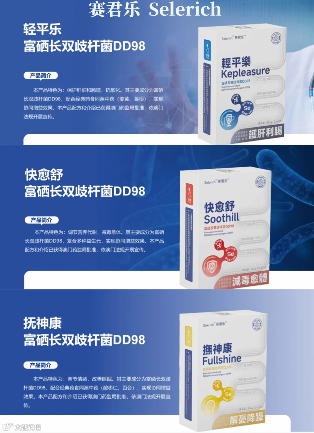 深圳赛里奇科技有限公司致力于创建全球领先的富硒微生物研发与应用平台,以科学循证的研发理念为指引,开发服务于患者健康需求的优质富硒产品。公司技术团队在长双歧杆菌DD98菌株、富硒工艺开发、功效和机理等方面进行了12年的深入研究,相关成果已发表国内外学术论文超过40篇,获得授权发明专利5项。基于这些技术,公司目前在中国大陆上市了一款“长双歧杆菌DD98复合益生菌固体饮料”,在中国澳门上市了三款“富硒长双歧杆菌DD98”益生菌产品“轻平乐”、“快愈舒”和“抚神康”。后续公司将进一步完善临床研究,力争将 “富硒长双歧杆菌DD98”申报为创新活菌药物,为人类健康做出贡献。