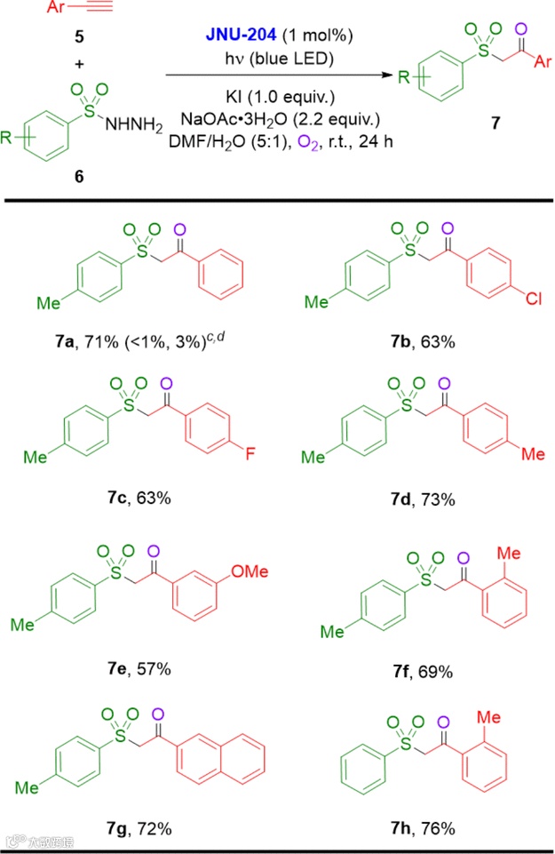 基于上述结果,作者报告了一种稳固的微孔Zn-MOF(JNU-204)的设计和合成,其中吡唑-苯并噻二唑-吡唑(D-A-D 型)光敏剂作为有机连接剂。以JNU-204为光催化剂,高效实现了三种不同氧化途径的有氧氧化反应,证明了JNU-204优异的光催化活性。循环实验证实了其异质特性和结构完整性,三次运行后光催化活性没有明显损失。JNU-204的合成应用进一步扩展到N-杂环衍生物的简便构建。这项工作成功地说明了将 D-A-D 型光敏剂构建到 MOF 平台中,可以作为一种强大且通用的多相光催化剂。这一研究分支在开发可见光有机转化方面应该具有巨大的潜力。