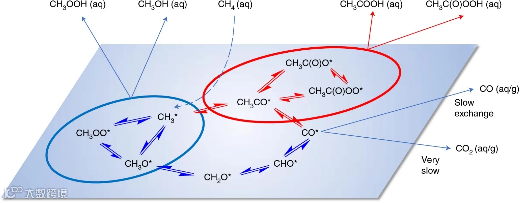 图 6. 所提出的表面催化反应的示意图。蓝色箭头和线用于 C1 中间体和产物,而红色箭头和线用于 C2 中间体和产物。每个产物的相表示为水相 (aq) 或在水相和气相之间分配 (aq/g);表面物种标有*。蓝色/红色椭圆中的表面物质通过水解或氢转移导致观察到的部分氧化产物。
