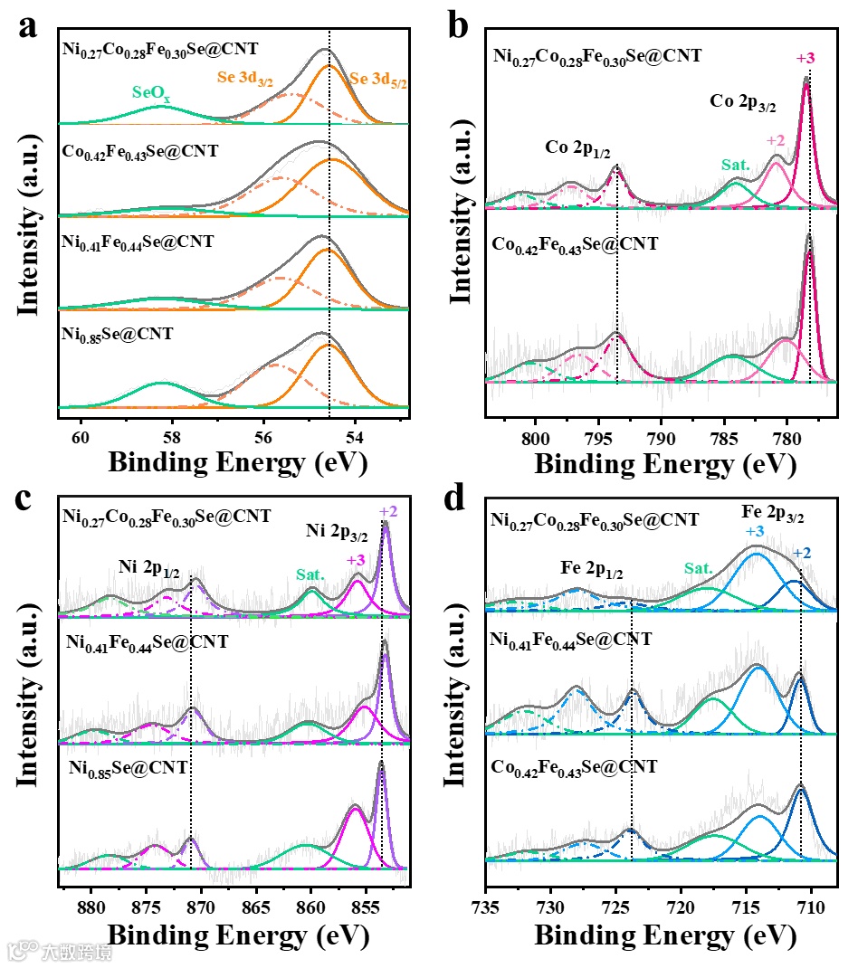 图3. Ni0.85Se@CNT, Ni0.41Fe0.44Se@CNT, Co0.42Fe0.43Se@CNT和Ni0.27Co0.28Fe0.30Se@CNT的高分辨XPS谱。(a)Se 3d XPS光谱图。(b)Co 2p XPS光谱图。(c)Ni 2p XPS光谱图。(d)Fe 2p XPS光谱图。