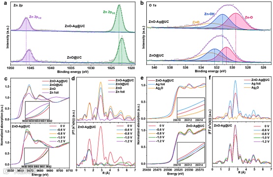 如图1a所示,DFT计算考察了两个反应途径(*COOH vs. HCOO*)来研究ZnO-Ag构型对CO和HCOOH的选择性。图1b展示了双金属构型下电荷密度的变化,Zn和Ag原子的电荷减少,而O原子周围的电荷增加,说明电子从Zn、Ag原子转移到了O原子。投影态密度(PDOS)(图1c-e)也证实了电子转移,并且结合吉布斯自由能图(图1f-i)可以推断出因电子转移所引起的电荷密度重构产生三个重要作用:(1)促进CO产生。和单金属Ag相比,ZnO-Ag的Ag d轨道中心向费米能级偏移(图1c),使其具备更强的与*COOH结合能力。正如图1f,h所示,相比于ZnO,ZnO-Ag中Ag的添加改变了速控步骤,形成*COOH的能垒要低于形成HCOO*的能垒,并且第二个电子/质子转移过程形成*CO步变得更热力学可行。因此,Ag的存在增强了催化活性,促进CO形成。 (2)抑制HCOOH产生。和单金属ZnO相比,ZnO-Ag的Zn d轨道和O p轨道中心偏离费米能级(图1d,e),表明Zn,O,Ag原子之间强的相互作用,源于增加的反键电子填充。当和Zn原子作用后,Ag原子的电荷密度减少,从而使得ZnO-Ag界面能够调节对中间产物的吸附强度。正如图1g所示,对于单金属Ag来说,*COOH和HCOO*的能垒发生明显的重叠的,导致差的选择性。而ZnO-Ag不仅在这两个竞争中间产物形成了大的能量差别(图1h),允许选择性产生CO,而且提高了HCOO*的能垒,从而抑制了HCOOH的形成。 (3)抑制H2产生。如图1i所示,ZnO-Ag展现了最高的能垒在*H形成步,电荷转移使其显著减弱了与*H的结合能力,有效抑制HER的发生,优于单金属Ag和ZnO。 ▲图1. ZnO-Ag理论计算结果。 基于上述理论计算的指导,本研究进一步实验合成ZnO-Ag双金属催化剂,通过“瓶中双船”的策略来设计合成。首先,本工作使用创新的双活化造孔技术,生产出具有超高比表面积的碳纳米球(UC),其比表面积达到4115 m2/g,孔容2.43 cm3/g。然后再通过Zn2+-Ag+前驱体湿法浸渍和热解反应,得到超细ZnO-Ag纳米颗粒植入在UC纳米孔中(ZnO-Ag@UC)。HRTEM和HAADF-STEM结果显示ZnO相和Ag相成对组成了粒径为3.1 nm的纳米颗粒,完全吻合孔结构分析的结果。UC的较大孔径3.1 nm对应孔内ZnO-Ag纳米颗粒,较小的2nm孔径则恰好固定住纳米颗粒,体现了“瓶中双船”结构。 ▲图2.“瓶中双船”设计概念和结构表征。 如图3a,b所示,XPS结果揭示了Ag调控了ZnO的化学环境,ZnO-Ag@UC的Zn 2p和O 1s峰分别向更高和更低的结合能偏移,证实了电子转移现象。同步辐射XANES数据(图3c,e)证实了在Zn-Ag-O异质界面上Zn和Ag均失去电子,呈现更高的氧化价态;EXAFS数据(图3d,f)则揭示了配位环境的变化,ZnO-Ag@UC里Zn和Ag的配位数和键长均减小。特别是在CO2还原反应的原位条件下,ZnO-Ag@UC的电荷转移和配位环境变化进一步增强,说明了与反应中间产物之间强烈的相互作用。XPS和原位XAS数据从实验上证实了电子转移效应,和理论计算结果完全吻合。 ▲图3. 化学环境和电子转移分析。 图4展示了催化剂CO2电还原性能。ZnO-Ag@UC展现了最高达98.1%的法拉第效率生产CO,以及60.9%的能量效率,胜过之前报道的Zn基材料。特别是,得益于独特的“瓶中双船”结构,ZnO-Ag@UC实现了超过150小时的超长稳定性(图4e),保持90%以上的法拉第效率。在150小时稳定性测试后,ZnO-Ag@UC仍保持着完整的ZnO相和Ag相(图4f)。如图4g-m,双金属的形貌未发生改变,仍成对地组成一个完整的纳米颗粒,保持着大约3.1nm的尺寸,未发现明显的团聚和脱落。这些证实了催化剂优异的稳定性。 ▲图4. CO2电还原反应性能和测试后表征。