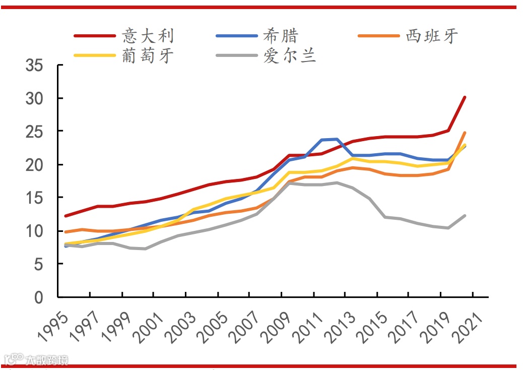 当下,虽然意大利经济复苏乏力,但其福利支出却并未明显缩减,意大利社会福利占GDP 的比重逐年抬升,2021年占比接近 31%,高于其它南欧边缘国家。