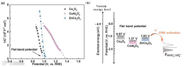 图5. 钴系氧化物的Mott-Schottky曲线(a)和平带电势示意图(b)