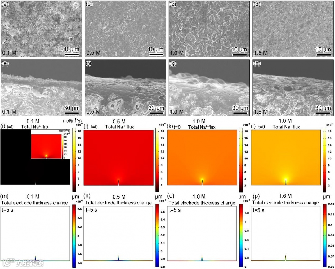 图3. 在a,e)0.1;b,f)0.5;c,g)1.0和d,h)1.6 M NaCF3SO3/TEGDME电解液中,第100次循环后Na电极表面和截面的SEM图,以及i)0.1 (插图中指示范围扩大);j)0.5;k)1.0和l)1.6M NaCF3SO3/TEGDME电解液中的Na+通量分布;在浓度为m)0.1;n)0.5;o)1.0;p)1.6M的NaCF3SO3/TEGDME电解液中,t=5s时,缺陷处Na电极厚度变化。