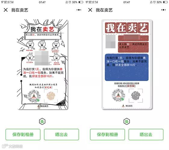 和其他红包类小程序一样,【我在卖艺】小程序也是生成一张带小程序码的海报,让你保存发朋友圈讨红包,而不一样的则是海报上的内容。