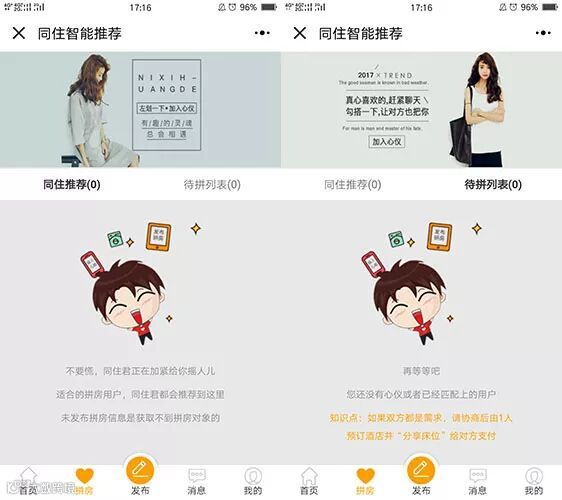 如果此刻你正一个人在外晃荡,觉得一个人住大房又太费钱的话,同样也可以使用小程序发布需求,寻找共享床位、合适的人。