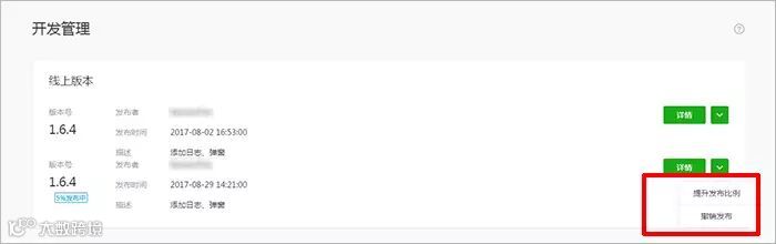 简单地说,开发者可以直接向所有微信用户发布新版本,也可以只向一部分用户初步发布。一不小心,小程序出现了bug,可以马上撤销发布,影响到的也只是小部分用户。