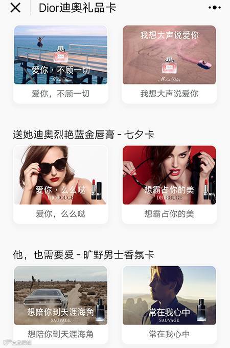 【Dior迪奥礼品卡】小程序不仅有为女生准备的口红、香水两款礼品卡,也为男生也准备了香水礼品卡,而且每个卡片的主题文案都充满了浓浓的爱意啊!例如“爱你,不顾一切”,“想霸占你的美”,“想陪你到天涯海角”。