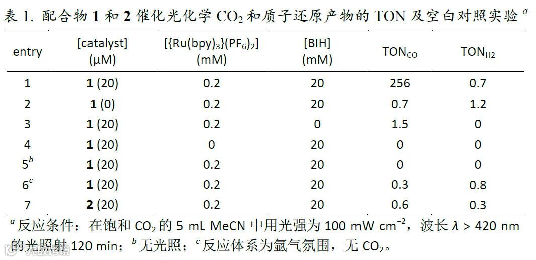 3. 研究发现添加TEOA能够抑制基于配合物1的三组分体系光催化CO2还原反应,同时促进质子还原反应,由此可以调节该光催化体系生成CO和H2的比例,从而可控生成含不同CO/H2比例的合成气。