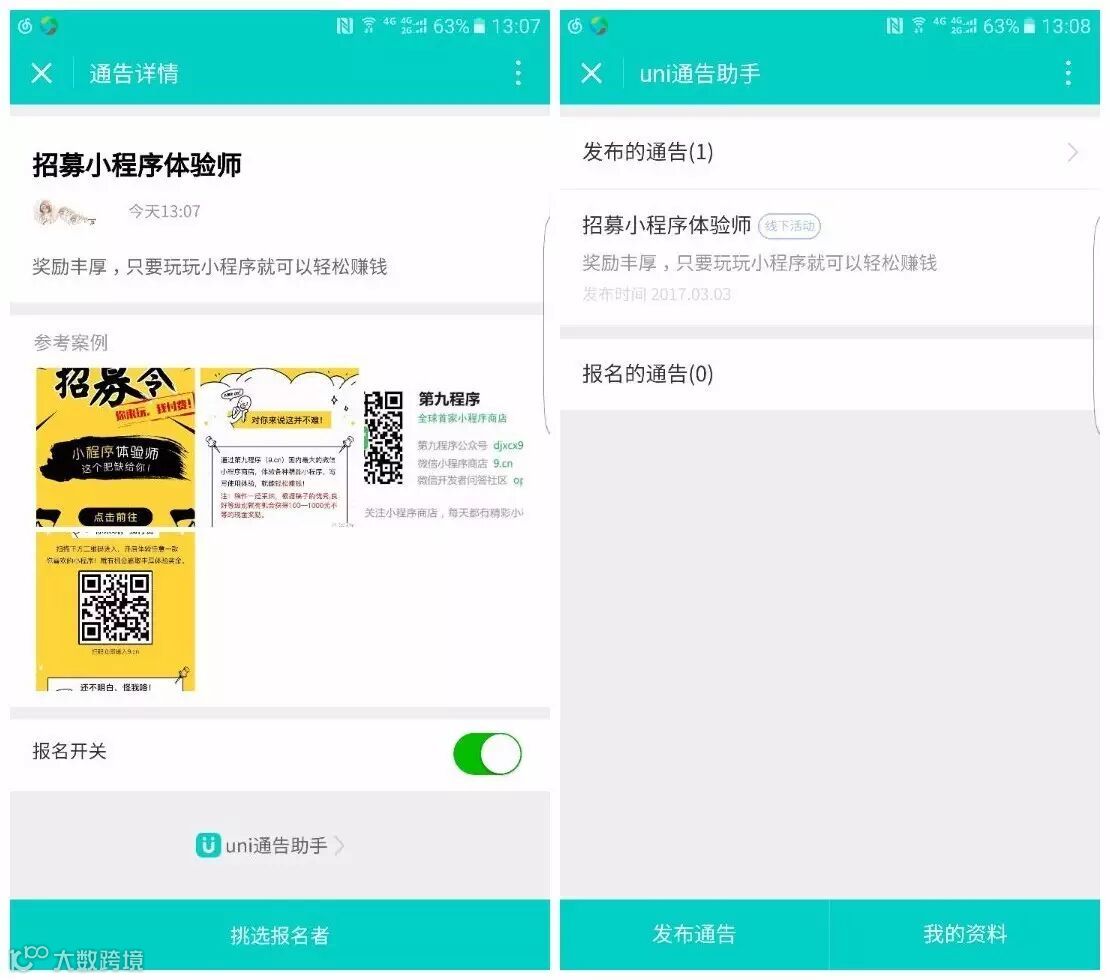 来自蘑菇街旗下uni的小程序。每日汇聚大量工作通告,帮助红人快速、便捷、准确地接到工作通告。uni通告助手不区分商家红人身份,每个人都可以在这里完善资料,发布通告,报名通告。(下图红框所示)