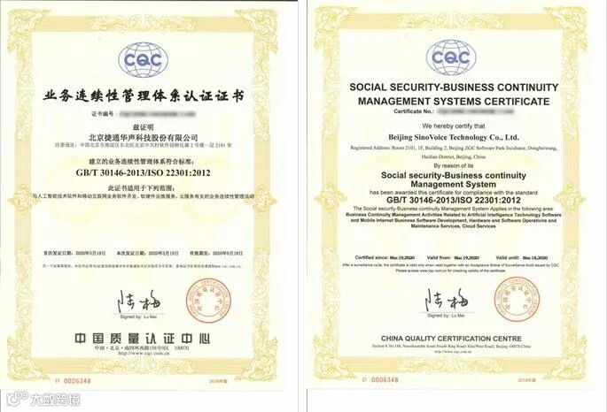 近日,捷通华声通过国家权威机构-中国质量认证中心的严格审核,获得ISO27018(个人可识别信息安全管理体系)和ISO22301(业务连续性管理体系)双重认证,成为国内为数不多获此认证的人工智能技术、产品与服务提供商。