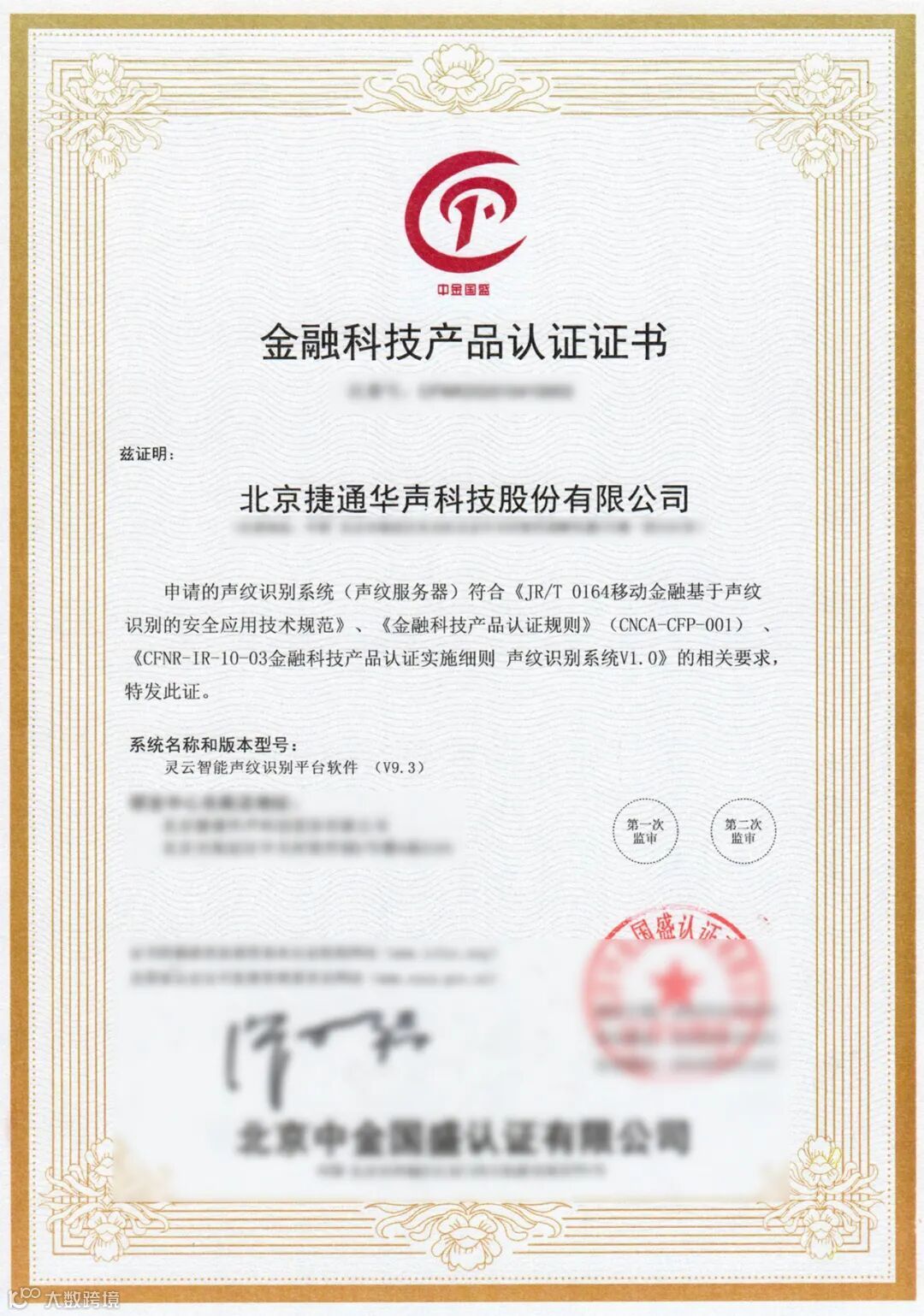 捷通华声推出的“灵云智能声纹识别平台软件”满足认证条件,经过文件审查、现场检查和型式试验结果的综合评定,获得“金融科技产品认证证书”,标志着灵云智能声纹识别技术在金融支付领域的高可靠性。