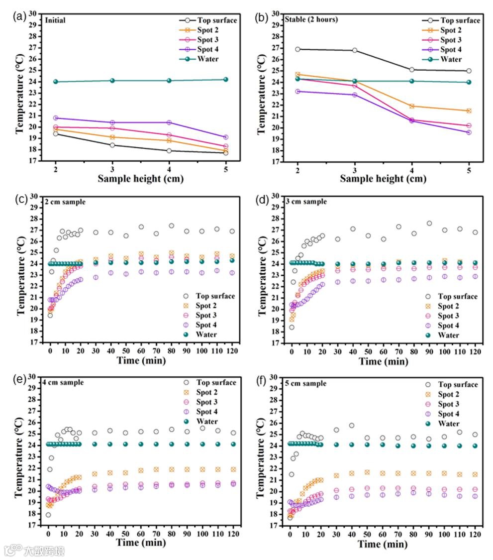 然而我们也对这个体系能量传递过程的动力学进行了研究。我们在蒸发装置的内部埋了五个温度传感器,同时引用红外相机对蒸发的上表面和侧面进行了实时的监测。通过对蒸发过程中温度变化的监测,我们观察到了热量传递方向的改变。随着冷蒸发表面面积的增加,我们发现了热量传递的方向的改变,从上到下变成了从下到上到侧面的变化过程。这从动力学上证实了我们这个体系是成功的逆转了热传递损失。