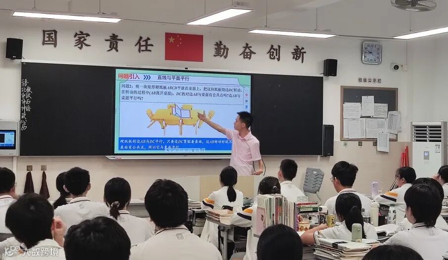 我校罗亨意老师通过图片展示实际生活中的“直线与平面平行”,让学生直观感受到数学来源于生活,引导学生归纳线面平行判定定理,体会由“线线平行”到“线面平行”的过程。整堂课不仅由浅入深,循序渐进,课堂气氛活跃,而且利用青鹿智慧纸笔系统高效完成了该节课的学习目标及重难点。