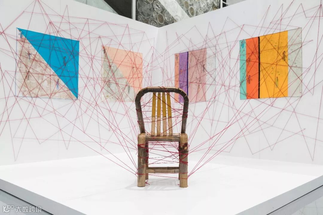 装置创意由丝巾上牵出无数条线隐喻台下贪看台上身的视线,最终缠绕到一张竹椅上。再现台上台下空间变幻的戏剧关系。
