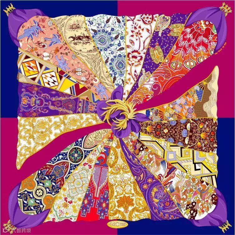 “锦绣世界”这款丝巾是世界丝绸经典纹样的大荟萃,用印花模拟中国传统滚边工艺将这些纹样连接起来,配以“浴火凤凰”丝巾扣作为装饰,把丝巾扎成蝴蝶型状,这样就组成一个锦绣世界。