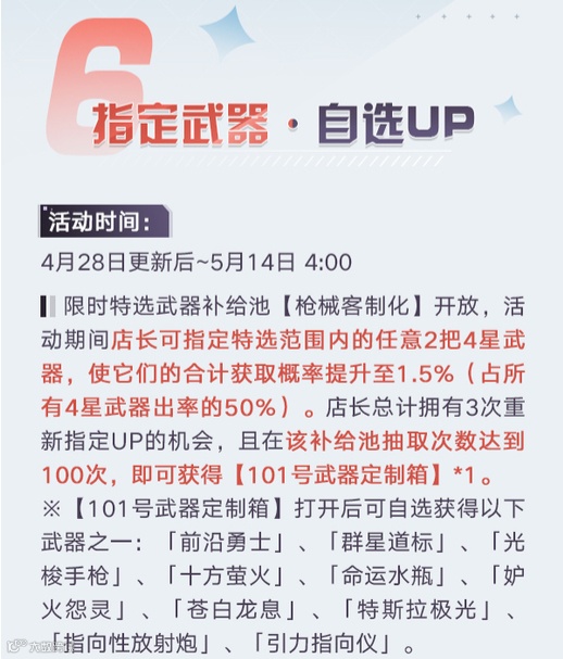 自选up!自选up!自选up!前沿勇士!前沿勇士!前沿勇士!重要的事情说三遍!千呼万盼始出来,终于等来了前沿up,没有前沿受苦至今的我热泪盈眶,颤巍巍的打开了自己扁扁的钱包。当然这次武器up非常人性化,如果有前沿多的用不完的店长,也可以选择别的武器up,手动滑稽。