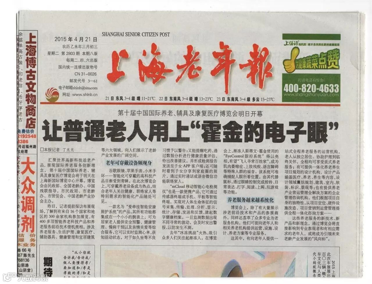2015年4月21日,青研“EyeControl眼控系统”亮相《上海老年报》头版头条