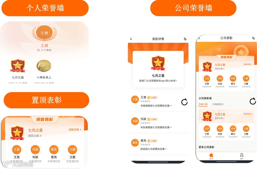 【公司表彰】工具可设置数字化荣誉墙,为员工汇总各类表彰、奖励,荣誉墙长期开放,全员可见。