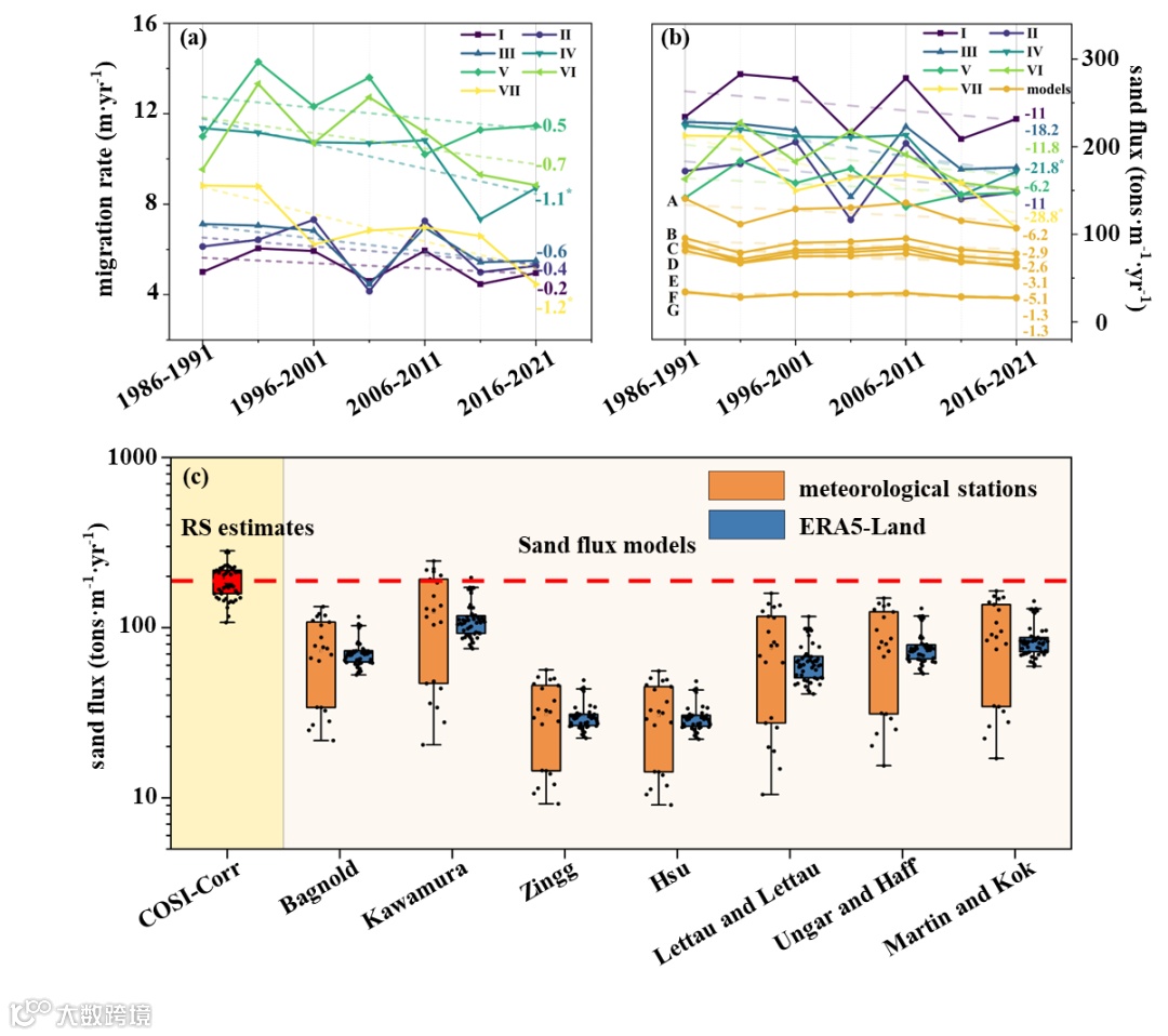 1986年以来新月形沙丘的移动速率及输沙量变化——基于观测和模拟结果的对比