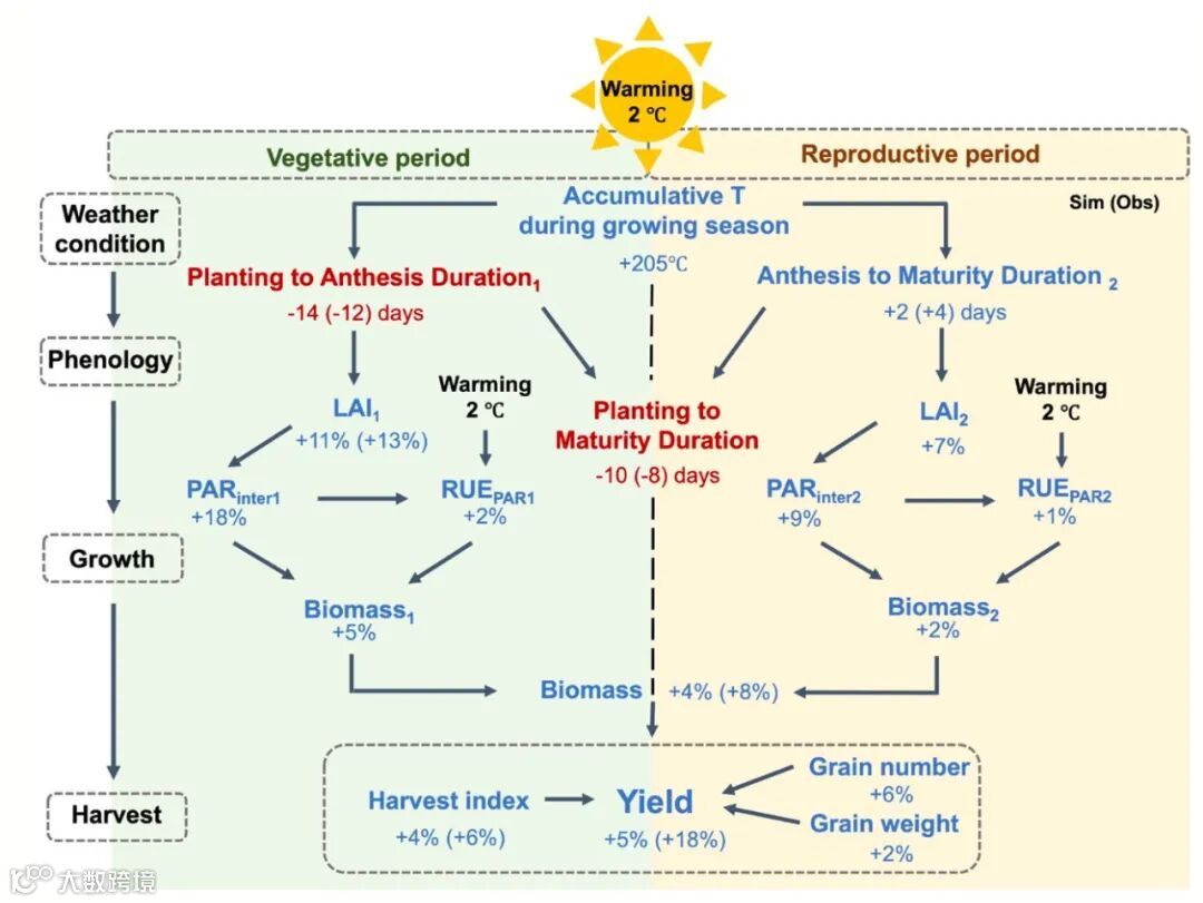 增温2°C情景下小麦生长发育和产量形成变化的流程示意图