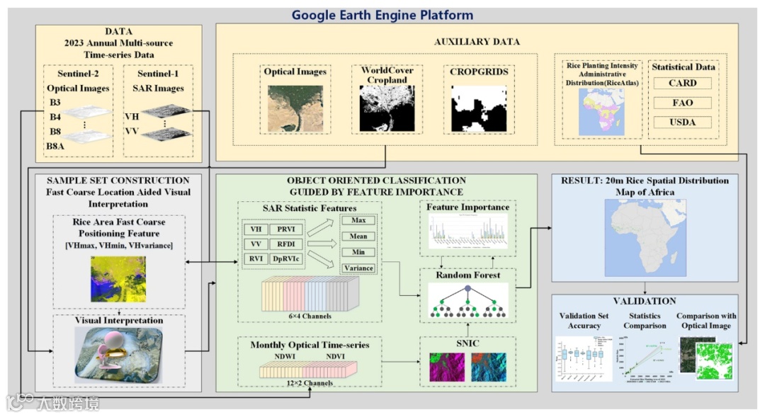 论文概要:作为非洲第三大粮食作物,水稻种植对区域粮食安全具有战略意义。研究显示,尽管当前非洲水稻产量仅占全球总量的4.7%,其需求增速已突破年均6%,远超其他主粮作物,面对持续增长的市场需求,近三十年来,非洲年均扩张40万公顷耕地,以驱动本土产量提升。为促进当地粮食和营养安全,非洲水稻中心提出“2030非洲水稻研究与创新战略”,旨在增加非洲水稻面积,同时转变以水稻为基础的农业食品体系,然而,非洲水稻种植面临诸多挑战,极易受到极端天气事件、降水模式变化和气温上升等气候变化的影响;另外,非洲地区的土地利用变化,尤其是城市地区的扩张和森林砍伐,也会影响水稻种植区的分布。因此,实现非洲地区高分辨率水稻空间分布制图,对于监测整个大陆的水稻种植状况至关重要。该研究攻克非洲水稻测绘的多重技术壁垒,针对热带地区复杂物候特征导致的时序遥感信号异质性,创新性整合双极化SAR数据散射特征与机器学习算法,构建“散射特征粗定位-多源时序精分类”的技术框架;通过发展面向对象的特征重要性分类器,突破传统光学遥感在雨养水稻识别中的技术瓶颈,实现准确的水稻分布制图。