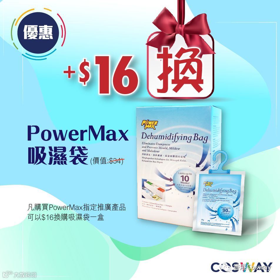 雨季又到,屋企唔夠通風?衣物好易有「噏味」!而家買PowerMax 指定推廣產品可以$16換購PowerMax吸濕袋一盒,PowerMax吸濕袋擁有卓越吸濕效能,消除濕氣,預防細菌、霉菌和難聞氣味﹔體積細小,備有掛鉤,方便掛於衣櫥。效果仲可長達十星期。