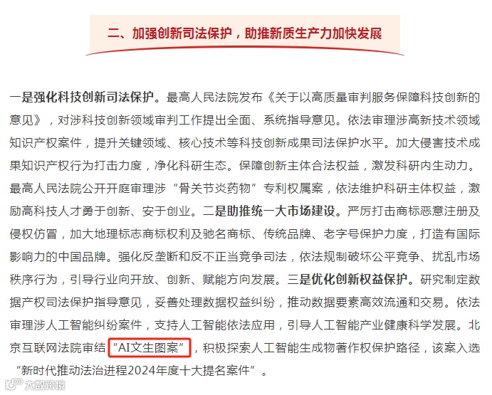 4月21日,最高人民法院举行新闻发布会,发布《中国法院知识产权司法保护状况(2024年)》,北京互联网法院“全国首例‘AI文生图’著作权案”被写入该报告。