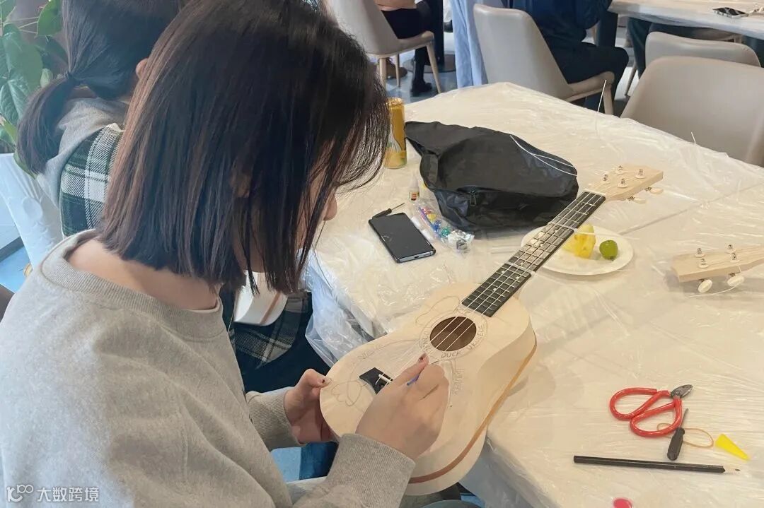 活动过程中,专业老师向大家讲解尤克里里的基本知识和制作过程,大家兴致勃勃、大显巧思,亲手装上琴码、绷上琴弦、调整音色、绘上彩绘......活动现场洋溢着欢声笑语。在老师的指导下,一件件精致的尤克里里被制做出来。