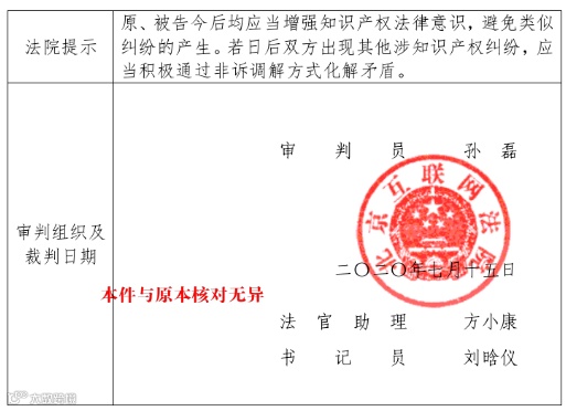 知产类小额程序表格式调解书区别于传统民事调解书的另一大特点便是设有“法院提示”这一内容,该部分内容由承办法官针对案件的审理情况给双方当事人进行释法提示,告知双方今后均应当增强知识产权法律意识,避免类似纠纷的产生。若日后双方出现其他涉知识产权纠纷,应当积极通过非诉调解方式化解矛盾。