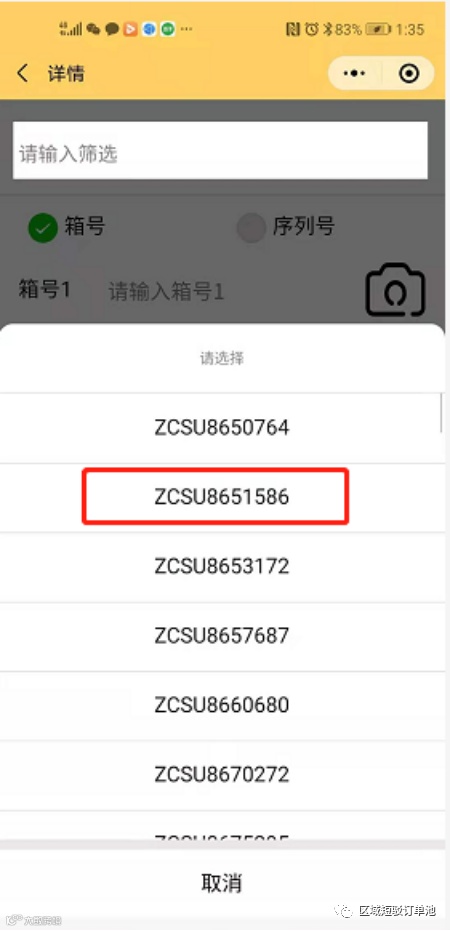 3、背上箱子后点击“箱号”,选择自己背上箱子的箱号。(如果作业要求上传箱门照片或者装箱单照片,请按照作业要求上传照片)。输入箱号(部分数字)