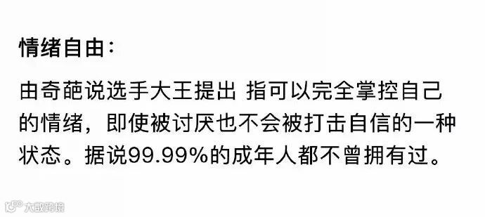“情绪自由”,一个听着就很酷的词,这个词一出来就仿佛已经刻画出了这么一个形象,一个无欲无求的人没有情绪上的波动,不会受到别人的影响,自己可以完全掌握自己的情绪情感,不会被别人牵着鼻子走。听着就是神人的做派,怪不得要让大王感叹,据说99.99%的成年人都不曾拥有过。