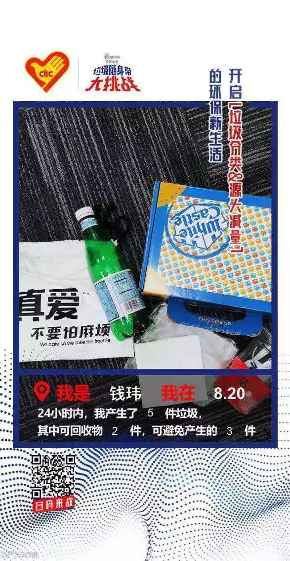 8月17日至24日,近70名伙伴参与了零废弃 #24小时垃圾随身带大挑战# 。该活动由中智上海白领青年志愿者总队联合捡拾中国共同发起,号召挑战者以24小时为限,把自己因为个人生活产生的所有垃圾(除去湿垃圾&厕纸类)装入随身携带的“随身垃圾袋”,呼吁大家开启源头减量、垃圾分类的绿色生活。