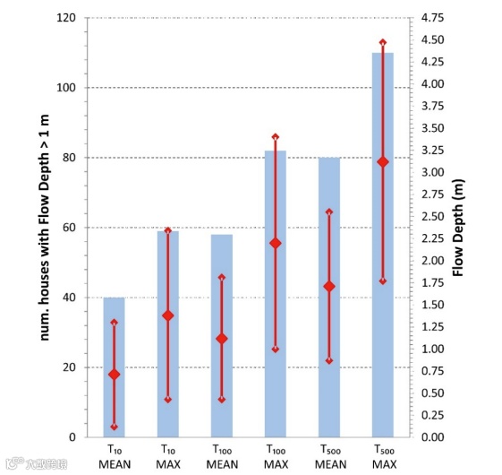 图2 不同重现期的流量深度值分布(平均值和0.5标准差,红线和点)。蓝色条形图表示流量深度在1 m以上的BICs数目(考虑平均水深和最大水深)。