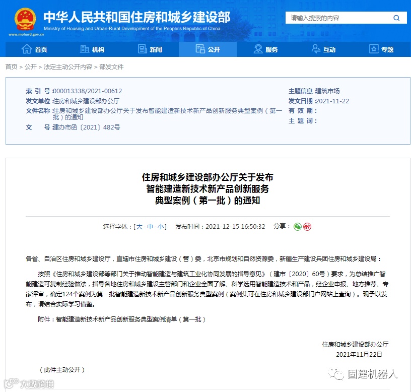 http://www.mohurd.gov.cn/gongkai/fdzdgknr/zfhcxjsbwj/202112/20211215_763435.html(住房和城乡建设部办公厅关于发布智能建造新技术新产品创新服务典型案例(第一批)的通知)