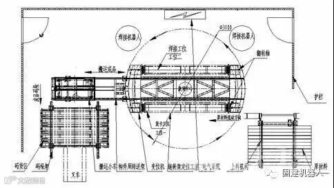 机器人柔性焊接工作站立足于一小型自动化流水线作业,能焊接长度在2.5米以下的各种工件,集自动上料、半自动定位装卡、自动焊接、自动卸货于一体。从而降低工人劳动强度,提高生产效率。为了达到总体设计要求,制定了满足要求的技术方案,该设备主要由工件定位工装、智能搬运器、变位机、构件周转架、码垛架、送料机构、电气及气动系统等构成一小型流水线,见图1。