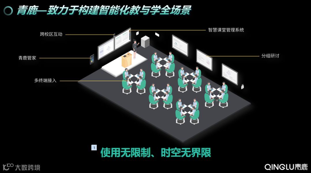 会上,青鹿展示了全新出发的青鹿智慧课堂2.0——无限课堂,主要包含智慧课堂管理系统、多屏分组研讨系统、跨区域互动系统、多终端接入系统、以及青鹿管家(智能管控),构建全场景的智能化教学空间,让师生体验到“时空无界限,使用无限制”的智能化教学模式。